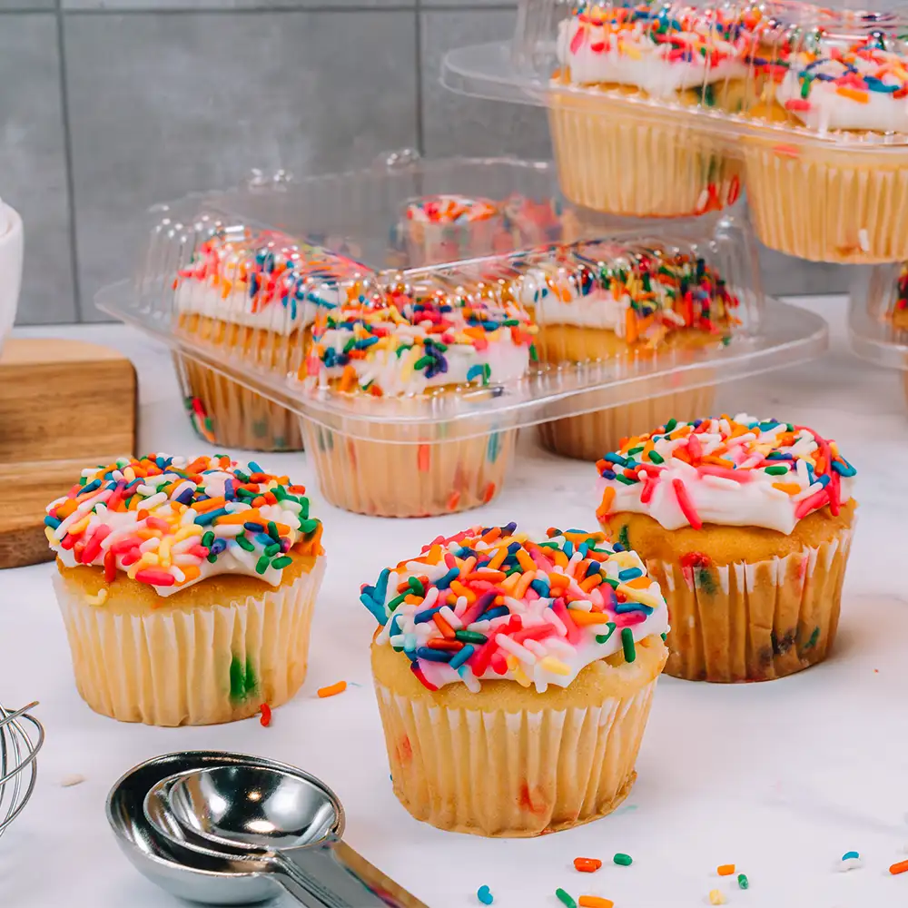 Ingredients: Cake Base (sugar, enriched wheat flour bleached (flour, niacin, iron, thiamine mononitrate, riboflavin, folic acid), egg whites, soybean oil, propylene glycol mono- and diesters of fatty acids, leavening (baking soda, sodium acid pyrophosphate, sodium aluminum phosphate, monocalcium phosphate, aluminum sulfate), contains 2% or less of: cellulose gum, dextrose, egg yolks, food starch- modified, mono & diglycerides, natural and artificial flavor, nonfat milk, polysorbate 60, salt, sorbitan monostearate, soy lecithin, xanthan gum), Buttercream Icing (sugar, palm oil, water, canola oil, cottonseed oil, cornstarch, mono- and diglycerides, contains 2% or less of: artificial flavor, citric acid, polysorbate 60, preservatives (potassium sorbate, sorbic acid), salt), WATER, Soybean Oil, Sprinkles (sugar, hydrogenated palm kernel oil, corn starch, sunflower lecithin, fd&c colors (yellow #6 lake, yellow #5 lake, blue #1 lake, red #40 lake, red #3 dye), maltodextrin, carnauba wax, vanillin, cellulose gum), Potassium Sorbate Contains: Egg, Milk, Soy, Wheat