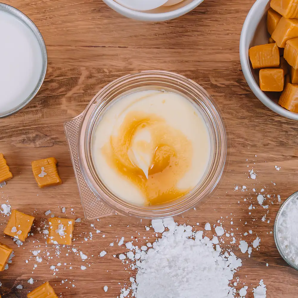 Ingredients: Cream Cheese Icing (sugar, cream cheese, (pasteurized milk and cream, salt, carob bean gum, cheese culture), palm oil. corn starch, contains 2% or less of: artificial flavor, beta-carotene (color), citric acid, dextrose, food starch-modified mono- and diglycerides, polysorbate 60, preservative (potassium sorbate), propylene glycol, salt, soybean oil, water), Cake Base (sugar, enriched wheat flour bleached (flour, niacin, iron, thiamine mononitrate, riboflavin, folic acid), egg whites, soybean oil, propylene glycol mono- and diesters of fatty acids, leavening (baking soda, sodium acid pyrophosphate, sodium aluminum phosphate, monocalcium phosphate, aluminum sulfate), contains 2% or less of: cellulose gum, dextrose, egg yolks, food starch-modified, mono & diglycerides, natural and artificial flavor, nonfat milk, polysorbate 60, salt, sorbitan monostearate, soy lecithin, xanthan gum), WATER, Caramel Topping: (Corn syrup, water, sugar, sweetened condensed skim milk (skim milk sugar), hydrogenated coconut oil, whey, contains 2% or less of: baking soda, butter (cream, natural flavor), mono- and diglycerides, natural and artificial flavor, preservative (potassium sorbate), salt, sodium alginate, soy lecithin, sulfites, trisodium phosphate), Soybean Oil, Mb Sea Salt: SEA SALT, YELLOW PRUSSIATE OF SODA ANTICAKING AGENT, Potassium Sorbate Contains: Egg, Milk, Soy, Wheat