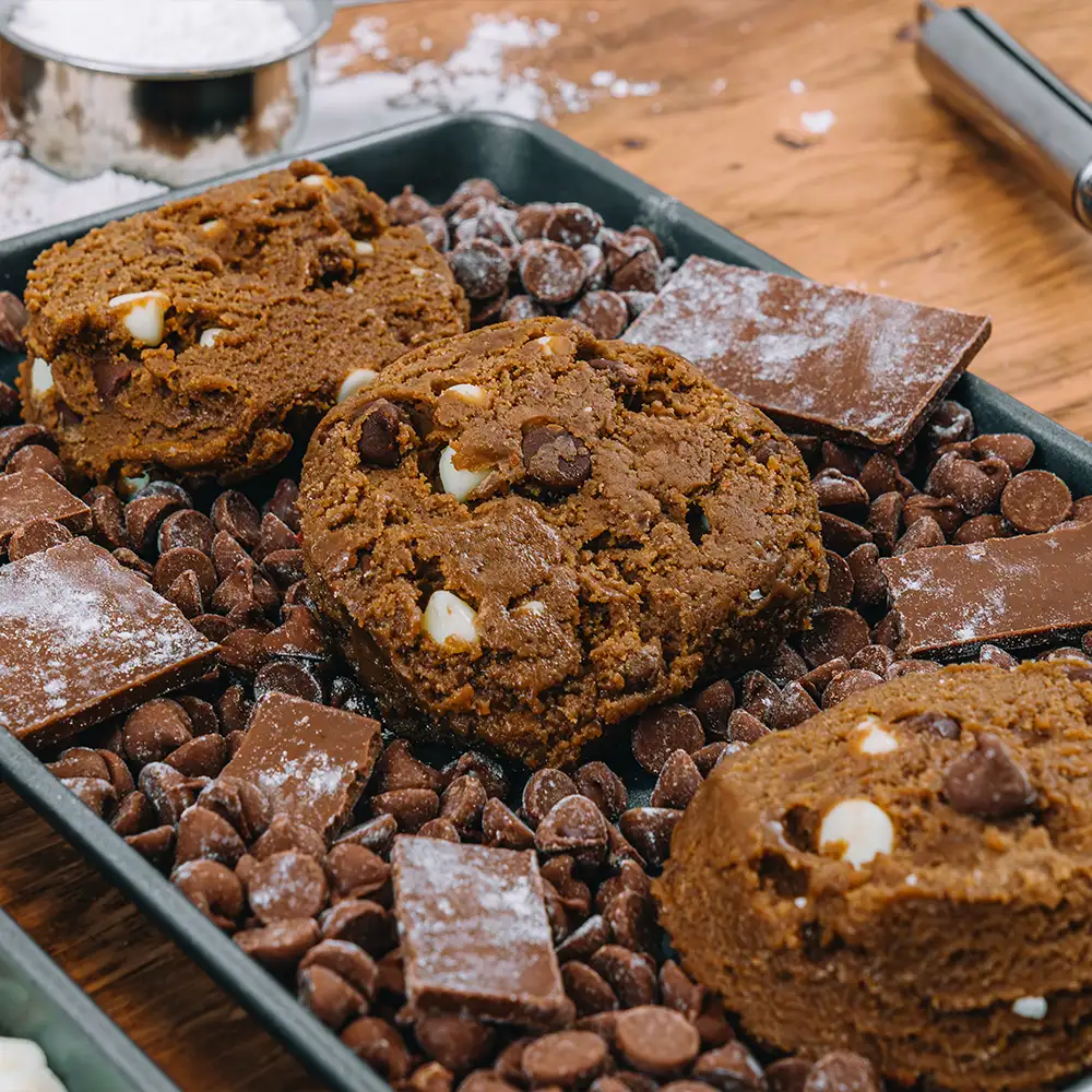 Flour (Bleached Wheat Flour (Bleached Wheat Flour, Niacin, Reduced Iron, Thiamine Mononitrate, Riboflavin, Folic Acid), Malted Barley Flour), Margarine (Vegetable Oil Blend (Palm Oil and Soybean Oil), Water, Salt, Contains Less Than 2% of the Following: Soy Lecithin, Vegetable Mono & Diglycerides, Potassium Sorbate (Preservative), Citric Acid (Preservative), Natural & Artificial Flavor, Beta Carotene (Color), Vitamin A Palmitate Added, Whey), Sugar, Brown Sugar (Cane Sugar, Cane Molasses), Hershey's Milk Chocolate Chips (Sugar, Chocolate, Nonfat Milk, Cocoa Butter, Milk Fat, Lecithin, Natural Flavor), White Chocolate Chips (Sugar, Skim Milk, Hydrogenated Vegetable Oil (Palm Kernel Oil, Soybean Oil, Palm Oil), Palm Kernel Oil, Contains 2% or Less of: Artificial Flavor, Soy Lecithin, Salt), Whole Eggs, Hershey's Chocolate Syrup (High Fructose Corn Syrup, Corn Syrup, Water, Cocoa, Sugar, Contains 2% or Less of the Following: Potassium Sorbate (Preservative), Xanthan Gum, Salt, Mono- and Diglycerides, Polysorbate 60, Vanillin, Artificial Flavor), Shortening (Interesterified Soybean Oil, Hydrogenated Cottonseed Oil), Cocoa, Baking Soda, Salt, Vanilla Flavor (Water, Sugar, Caramel Color, Artificial Flavor, Citric Acid (Preservative), Sodium Benzoate), Potassium Sorbate (Preservative), Sorbic Acid (Preservative). Allergens: Contains Egg, Wheat, Soy, Milk; Made in a Facility With Tree Nuts and Peanuts.